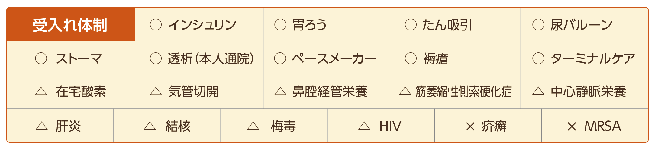 居室空間のご提供だけではなく、残存機能の維持・低下予防に鍼灸師によるレクリエーションや鍼灸マッサージ・歩行訓練や訪問歯科の治療等も受けていただくことが可能です。