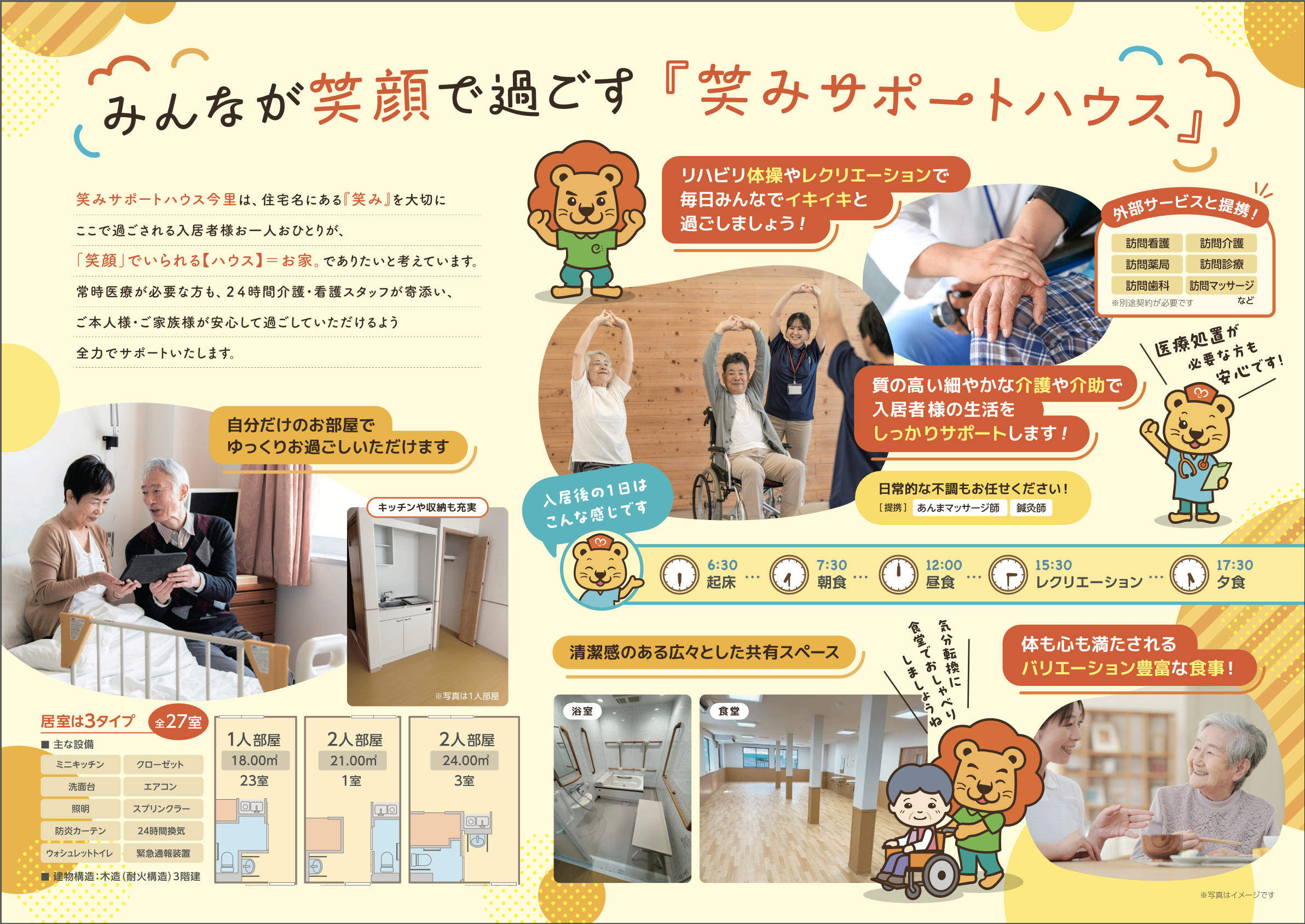 笑みサポートハウス今里は、住宅名にある『笑み』を大切にここで過ごされる入居者様お一人おひとりが「笑顔」でいられる【ハウス】=お家。でありたいと考えております。